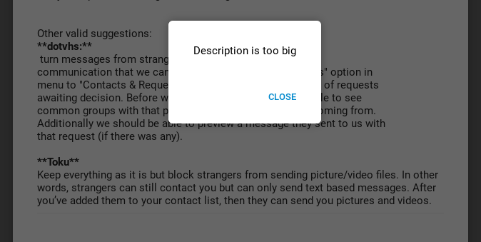 I agree with you that my approach is the simplistic one and it might require more thought on it. Maybe a different approach with the same goal. I personally don't like being ask for permission to allow others to contact me. To be honest? I would give users the choice to decide what the hell they want from Telegram instead... I know i know: more options = dead kittens.. Still i don't like that thinking: It's like saying the user is not capable of think by himself that others have to do the choices for them. They are dumb and not capable of thinking so someone else (Telegram in this case) has to throw them everything in their mouth and make them swallow it they like it or not. I love options and that's because i am here on Telegram because i can compile my own client and fucking do whatever i please even if Telegram forces me to do things as they think is right with their official clients. The point here is that even if Telegram doesn't like choices if you have the right skills you can add those choices by yourself.