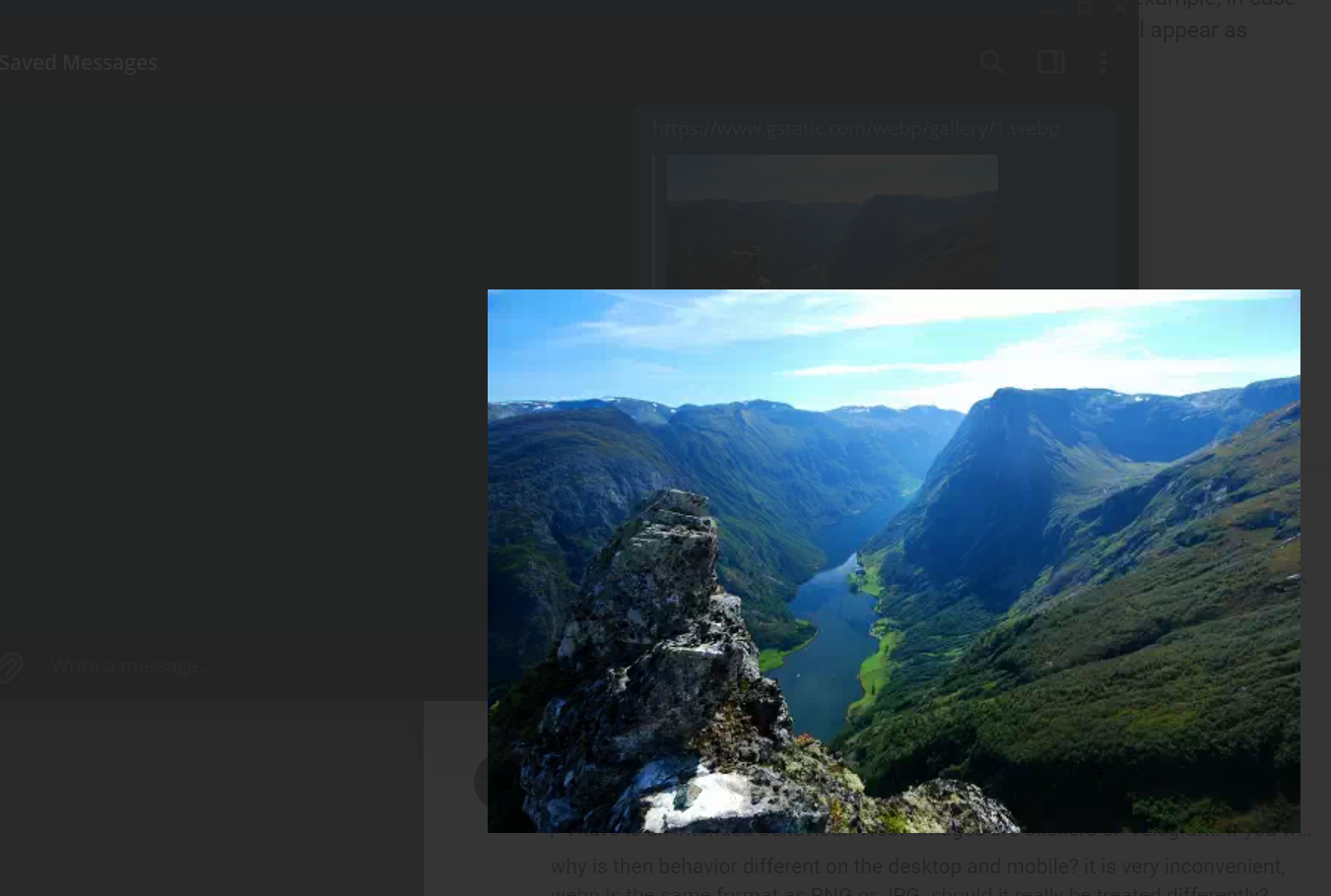 Sure. Test image: https://www.gstatic.com/webp/gallery/1.webp. Image was sent from desktop via file drag&drop. Could open and expand/zoom on desktop. Only menu appears on mobile, can't zoom or open.