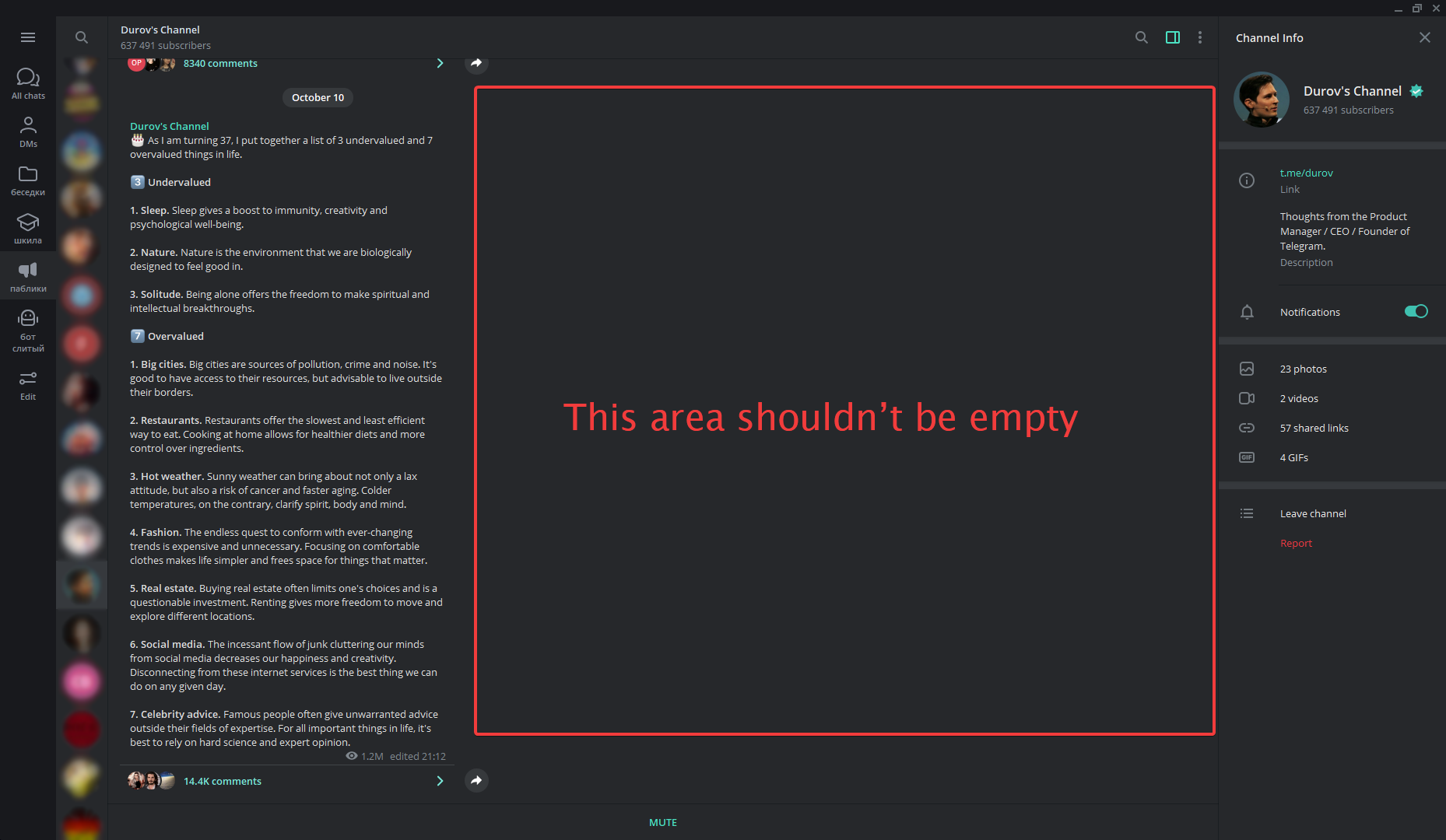 Your help needed: The team needs help with app's logs. Messages are missing on mobile but visible on Telegram Web and Desktop. Notifications of new messages are received, but messages don't appear in…