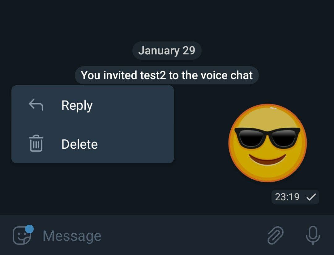 "Delete" option should not be visible on "invited to voice chats" service messages if you are not admin