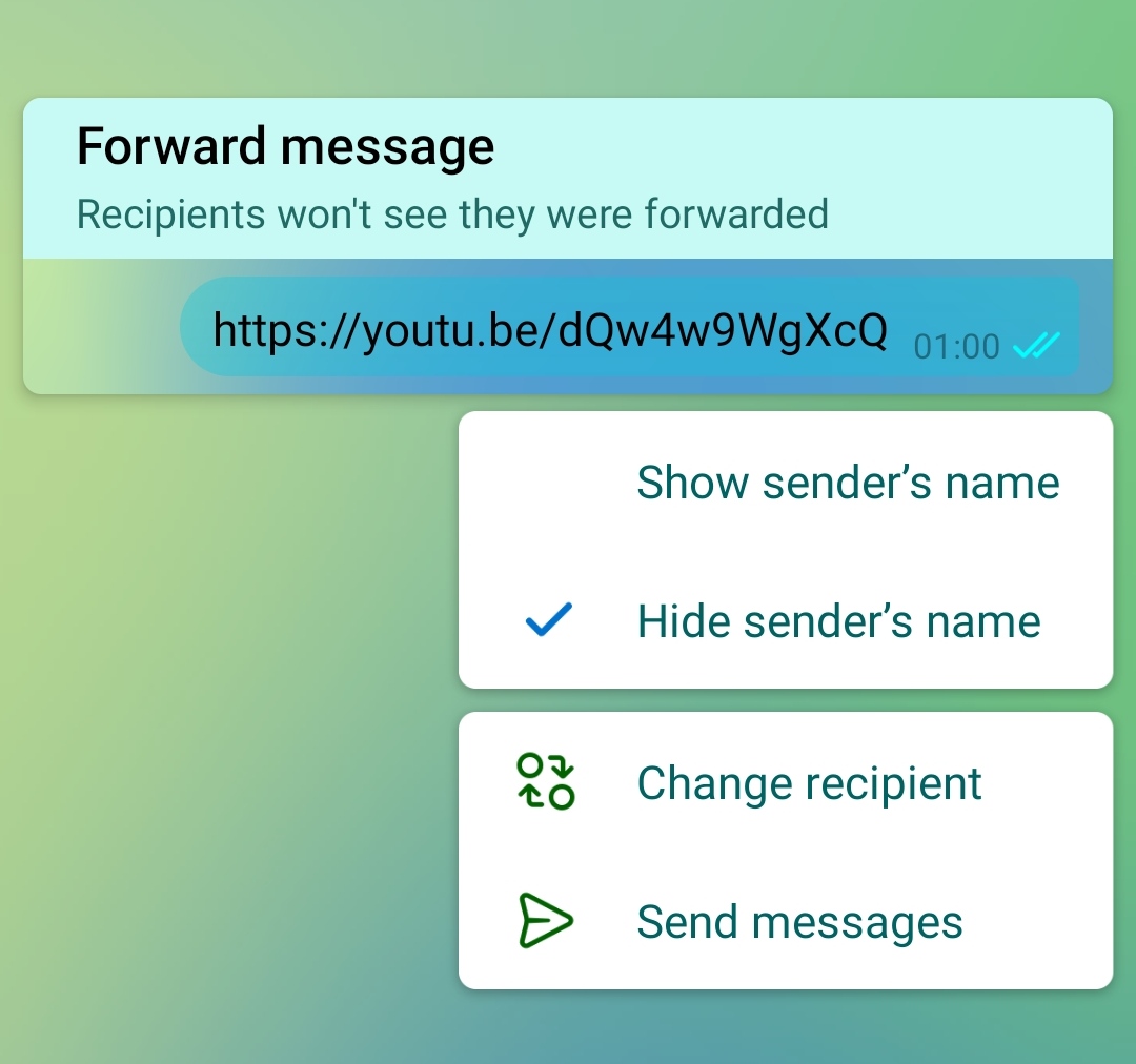 Option to forward messages without the name by holding the send button when selecting a chat to share (like Telegram X)