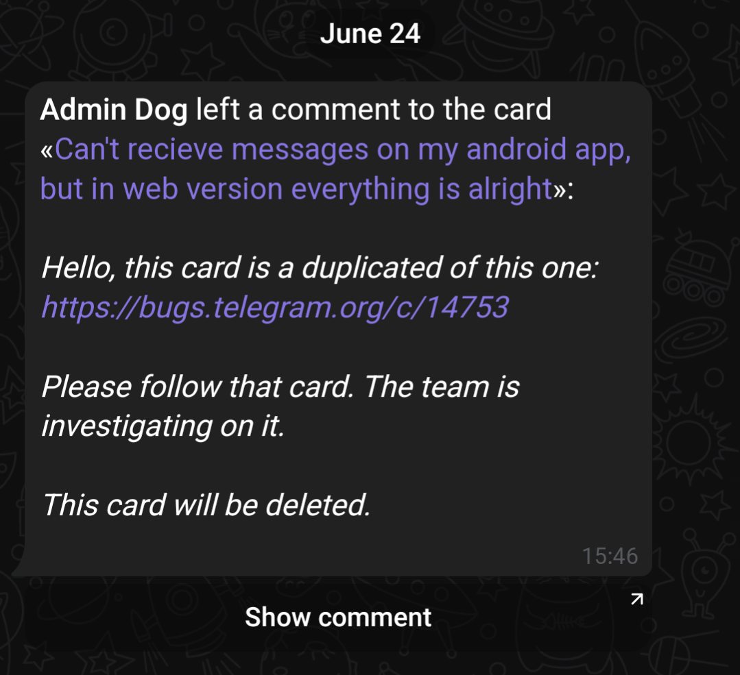 My original card was this one: bugs.telegram.org/c/18340, which is now deleted.