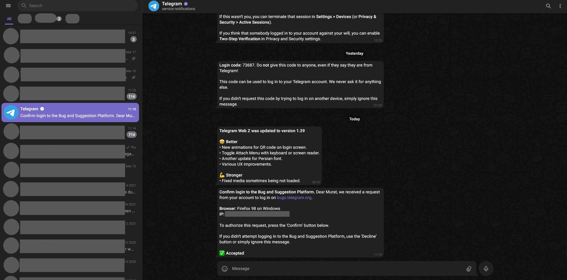 Telegram Web privacy mode for public areas
