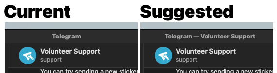 I use time tracking software on my Mac that reads window titles and applies rules to classify my time. It would be awesome if Telegram put the name of the contact, group, or channel that's currently open in the title bar, so that my time tracking software can automatically classify my time. For example, I use Telegram for group project discussions at school, but also for chatting with friends. Putting the chat title in the window title would let my time tracking software automatically count time spent in a project group chat toward that class, and count time spent in other chats toward socializing.