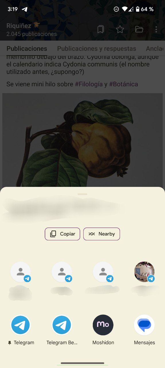 Since 8.8 version when sharing anything the direct share feature is broken. It's enabled in settings but still you will get NO telegram contacts (targets) to share to. You will get Whatsapp and Duo and other apps with contacts but NOT Telegram. Until 8.7 it worked but also wrongly as the suggested contacts were useless (random). But they were there. Please see Direct Share doesn't show your frequent cha... #979 . If you can fix both of those issues you will get more people using Telegram. If every time you share all you get is Whatsapp do you think people will share to Telegram ? I am waiting for year and half for the first issue but now it's "solved" as I have no target at all. I tested this on OnePlus with Android 11 and the bug is also there.