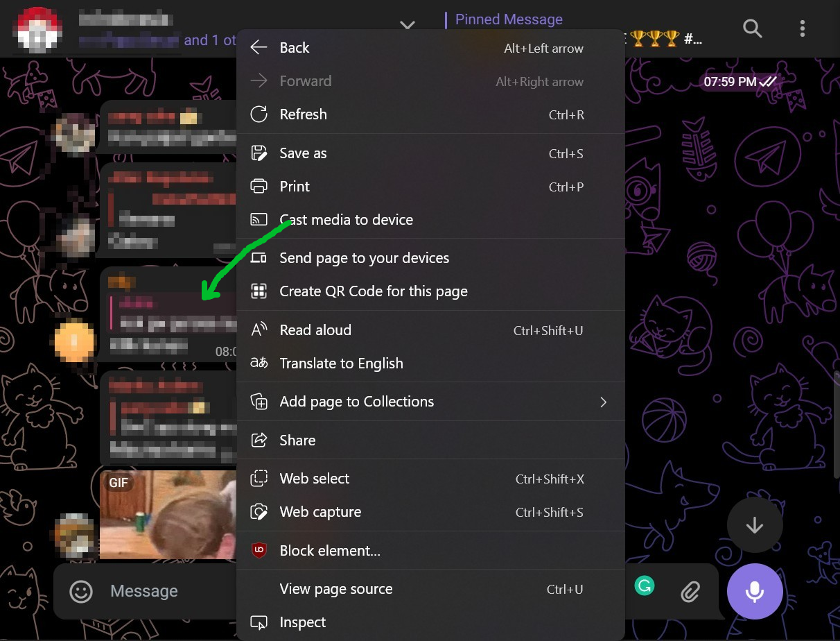 When you want to reply/get the 'Right Click' feature on Telegram K Web and I got the 'Default Right Click Output of Ms Edge' instead. You can see that I've already clicked and the message is just highlighted (green arrow).