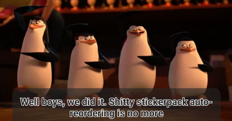 Add an option to disable auto-ordering of sticker packs. If you have a lot of packs, it make sense to order them in a way that makes it easy for you to find the right sticker. This has been the behaviour…