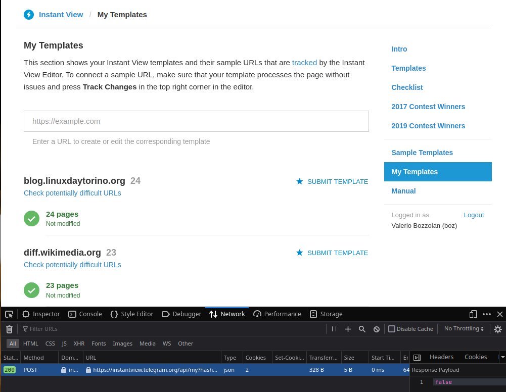 Internally, I see that the button fires the API action sendToContest returning the HTTP status code 200 with a JSON with just false. This API call is nonsense to me, since the popup said "it will NOT participate in contest" and since I don't want to participate to the contest. I just want to propose my InstantView template to the Telegram team.