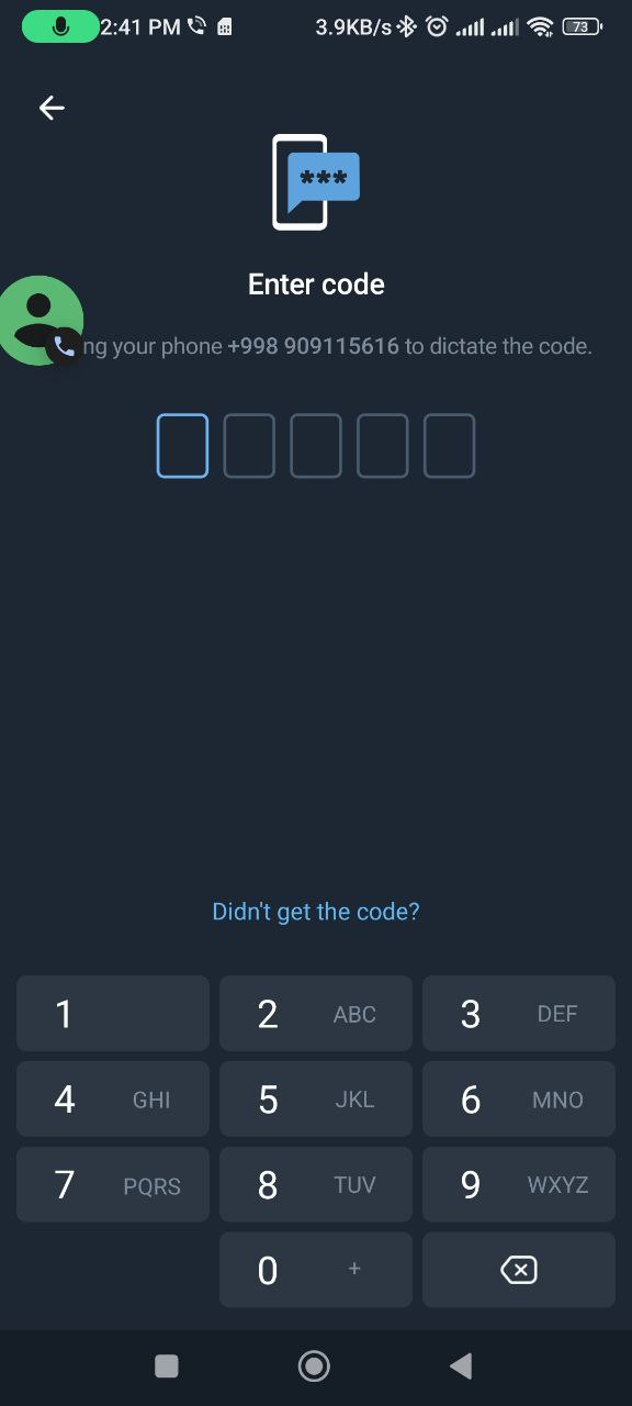 Clicking the button Didn't get the code? takes you to the phone number input window.