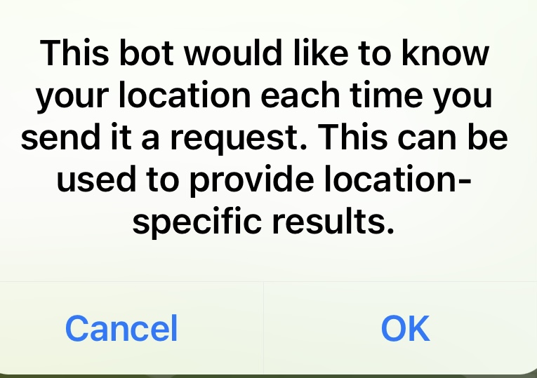 Telegram open alert with info: Each time when you use bot he got your location Confirm / Decline.