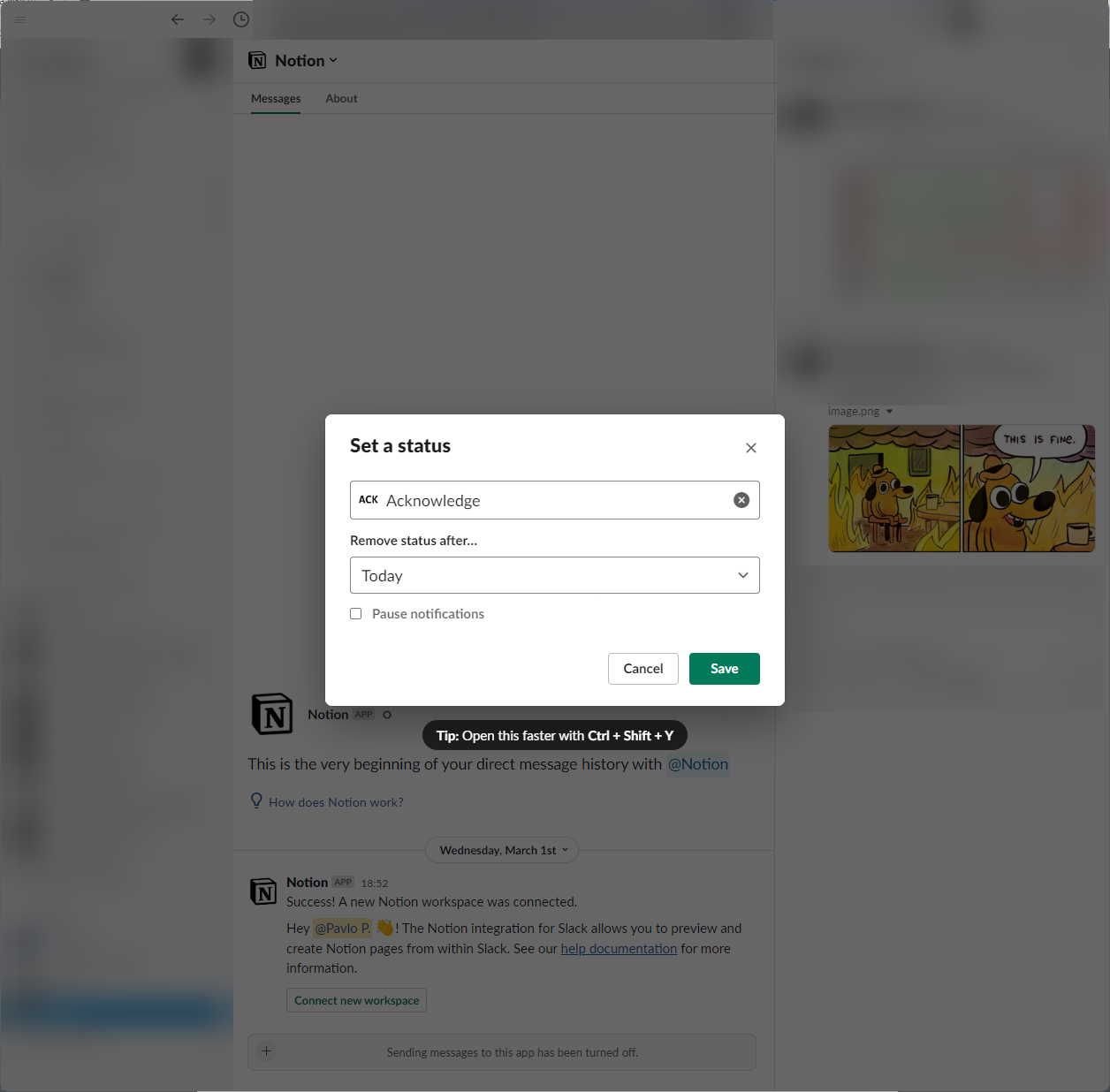 But if this is not possible, approach from Slack is also a good option (see screenshot attached), but it also allows you to add some description for status, which, I believe, is not possible in Telegram RN.