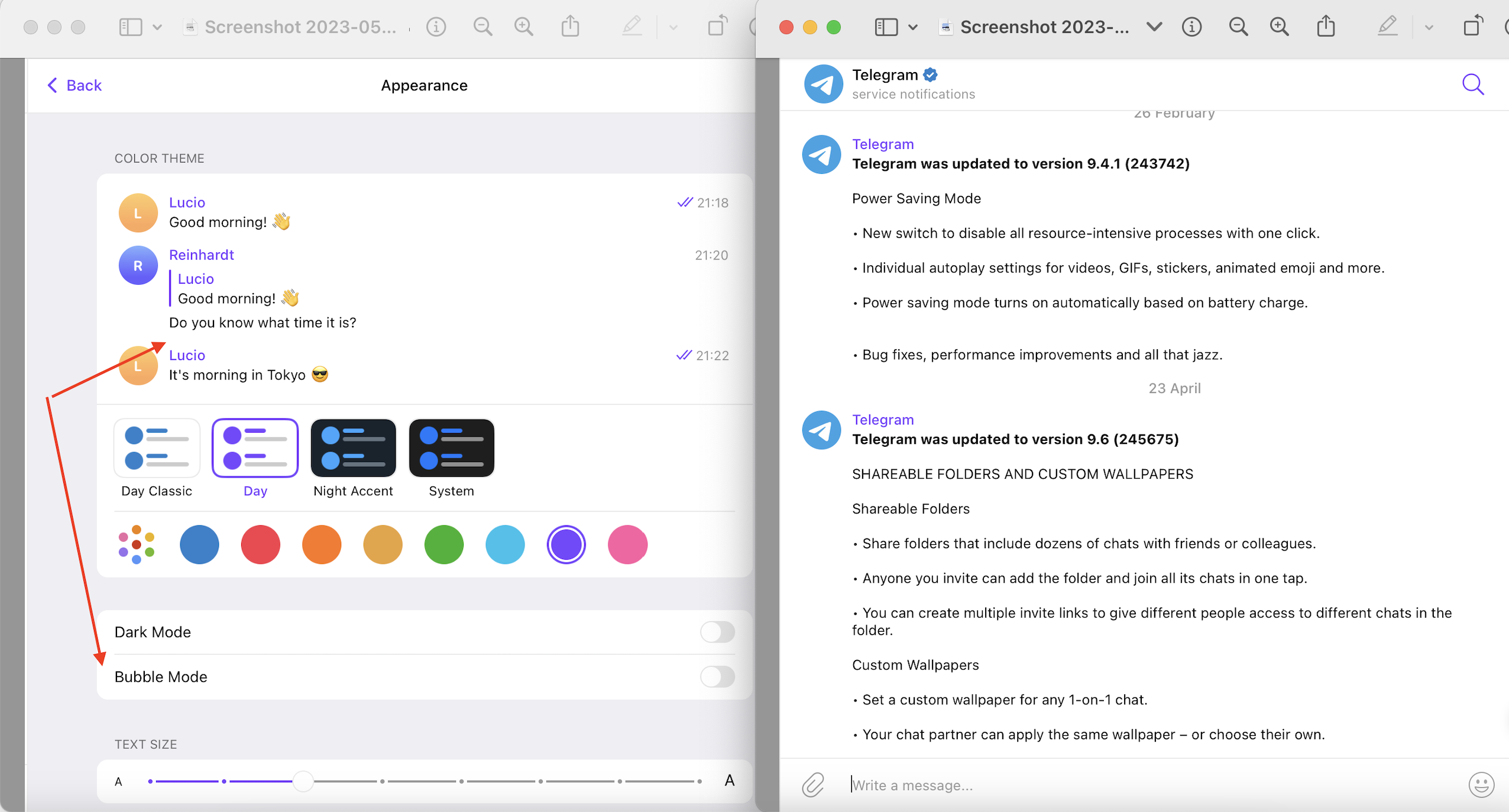 Disable bubble mode (like in macOS telegram version) to show messages in full width