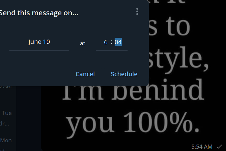 This message was scheduled to send at 5:55am in a few days. Preview says 5:54 and reschedule starts at 6:04.