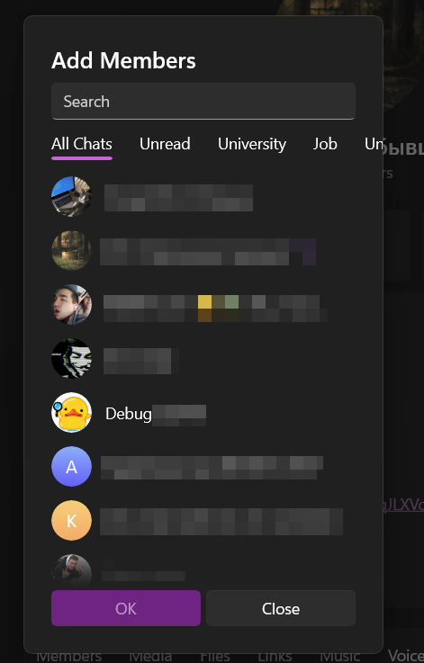 When you are trying to Add Members to a group, in an opened popup (see pic 1 or 3) – only groups and channels you own are visible. And it's not possible to find your contact, or any other person.
