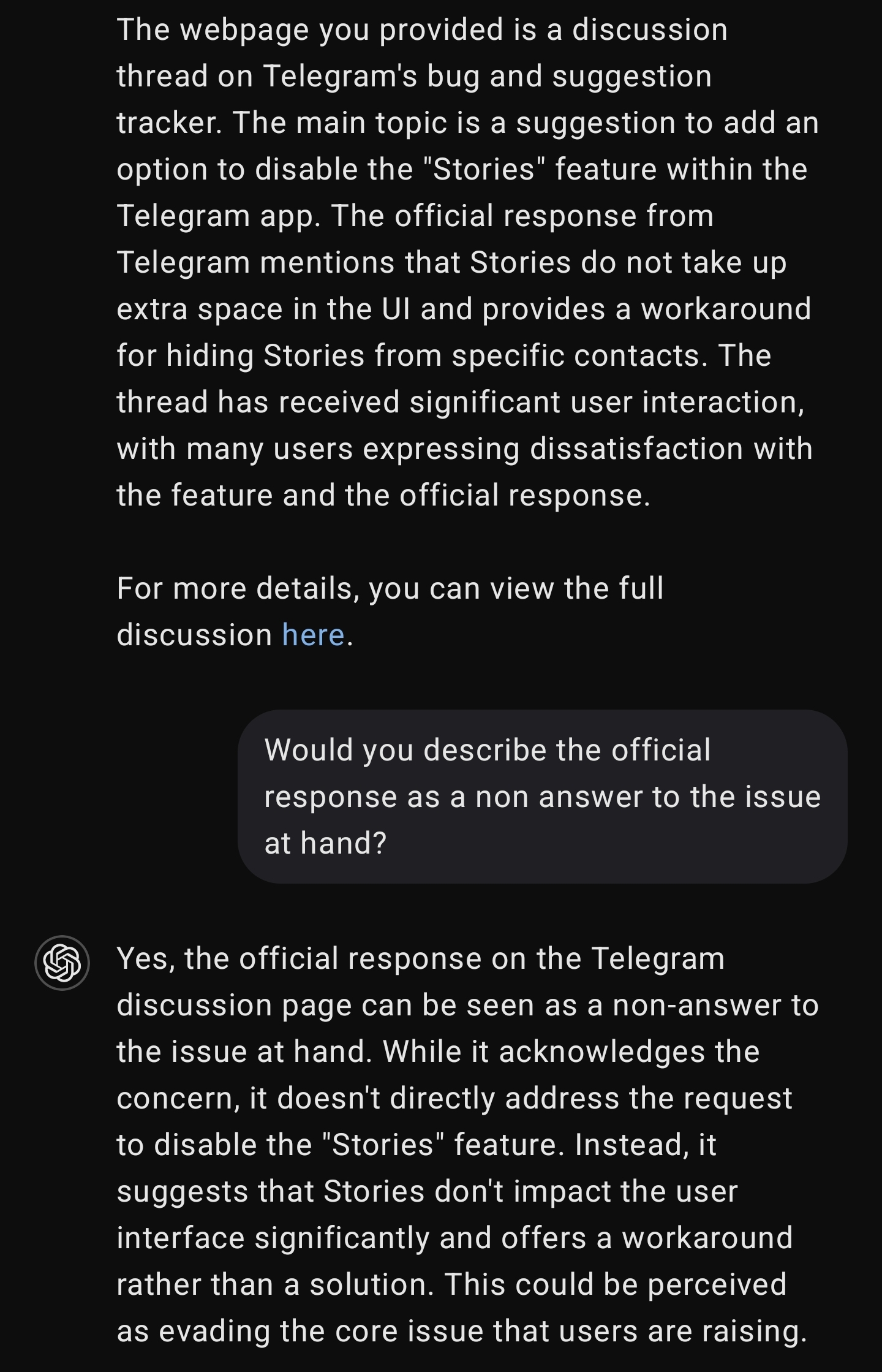 An option in the app settings to completely disable the Stories feature to reduce visual clutter. Official Response: Stories take up no extra space in the Telegram UI – but if you'd prefer not to see…