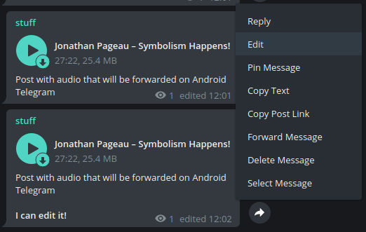 When I forward channel's post with audio on the same channel via Telegram Desktop I can't then edit it. But if I do it with Telegram Android editing option is available.