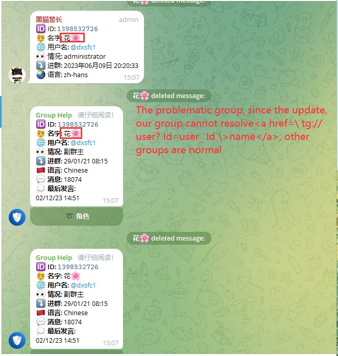 any messages sent by bots or users with mentions will not display properly, for example: <a href=\tg://user? id=user_id  >name</a> does not work properly in all groups with more than 170,000 members.