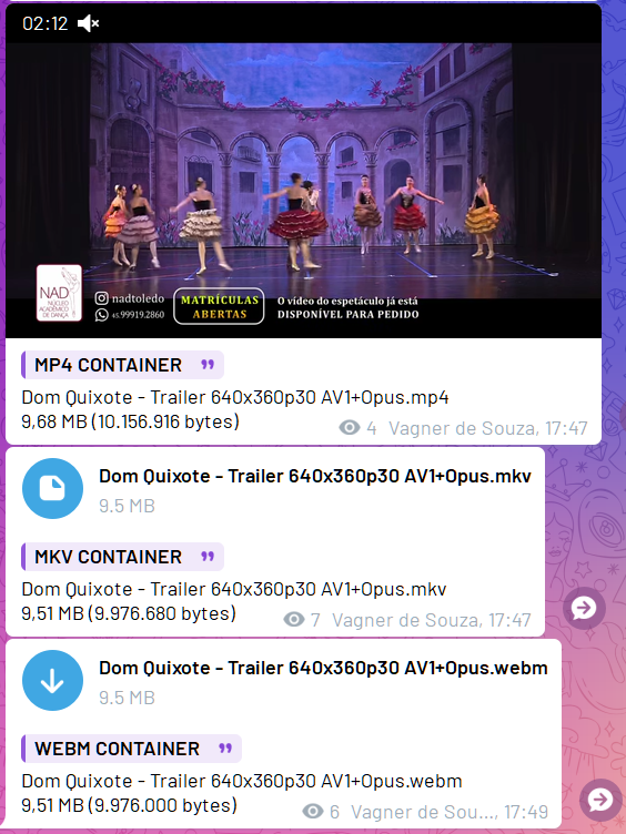 I would like to ask you, Telegram developers, to consider including video files with the MKV and WEBM extension as what they really are, VIDEO files, and not as if they were any ordinary document. You should also use the cover file embedded in the MKV or WEBM file as the cover of the video. It would also be interesting for Telegram to fully support videos with the AOMedia AV1 codec and Opus audio, on all devices where Telegram can run. Telegram should not consider a video only if it has the MP4 extension.