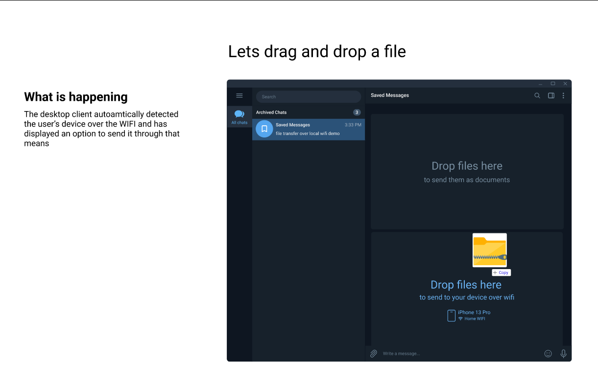 Enable seamless file transfers between Telegram Desktop and Mobile devices on the same Wi-Fi network. By leveraging local connections, this feature reduces reliance on Telegram’s cloud storage, saving space while offering users a faster, more secure way to share sensitive or large files. No third-party apps, no uploads—just drag, drop, and deliver, all within Telegram’s trusted ecosystem. Convenience meets efficiency.