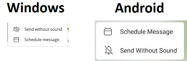 Inconsistent order of "Send without sound" and "Schedule message" options (Send button context menu) between Android and Desktop