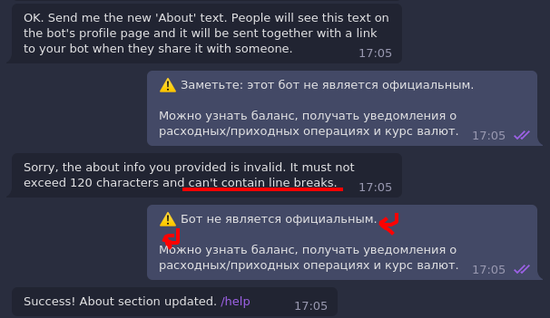 botfather says that the "About" text can't contain line breaks, but it can