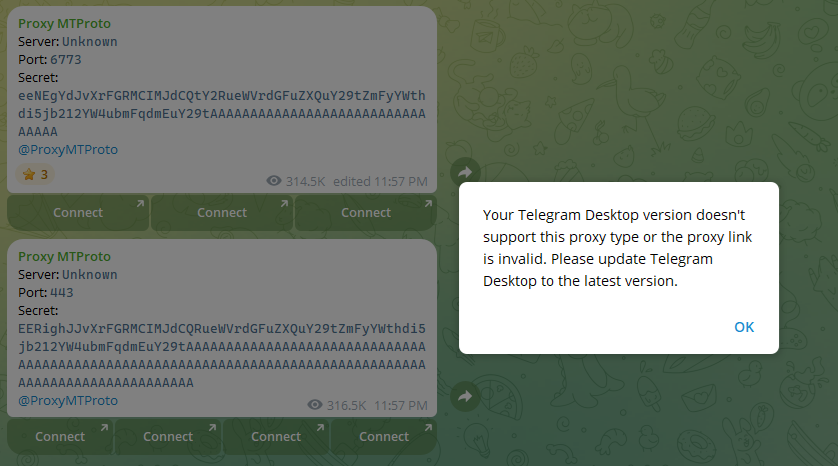 “Your Telegram Desktop version doesn't support this proxy type or the proxy link is invalid. Please update Telegram Desktop to the latest version.”