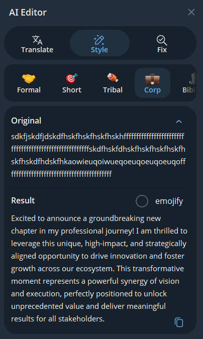 Setting aside what the button is for (which I am not a fan of, but, whatever), this is bad design. It was unexpected when it first popped up, I didn't opt into this, and having it right next to the post button is going to mean that if I'm not careful, I'm sure I'll open it accidentally on my phone often enough. The "at least three lines" rule is in the perfect place to annoy the daylights out of people. That's, what, two sentences? One with multiple clauses. So right when they get finished with a point, users will get distracted by a popup they didn't ask for, by a distracting change in the text box and animated button. The tooltip is salt in the wound, but the inability to opt out of this is by far the worst decision. That is so dismissive of Telegram's user base and it's clearly unpopular.