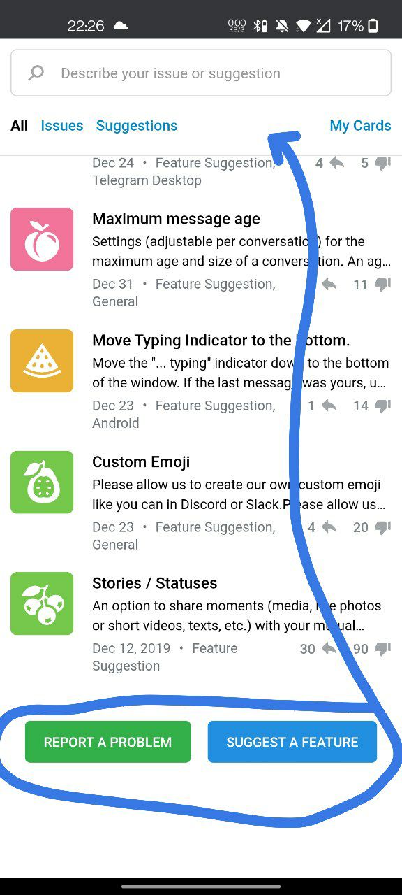 This platform is a place where users can vote for feature suggestions for Telegram or report issues with our apps. You are welcome to check out the existing suggestions and bugs, vote, or add your comments.