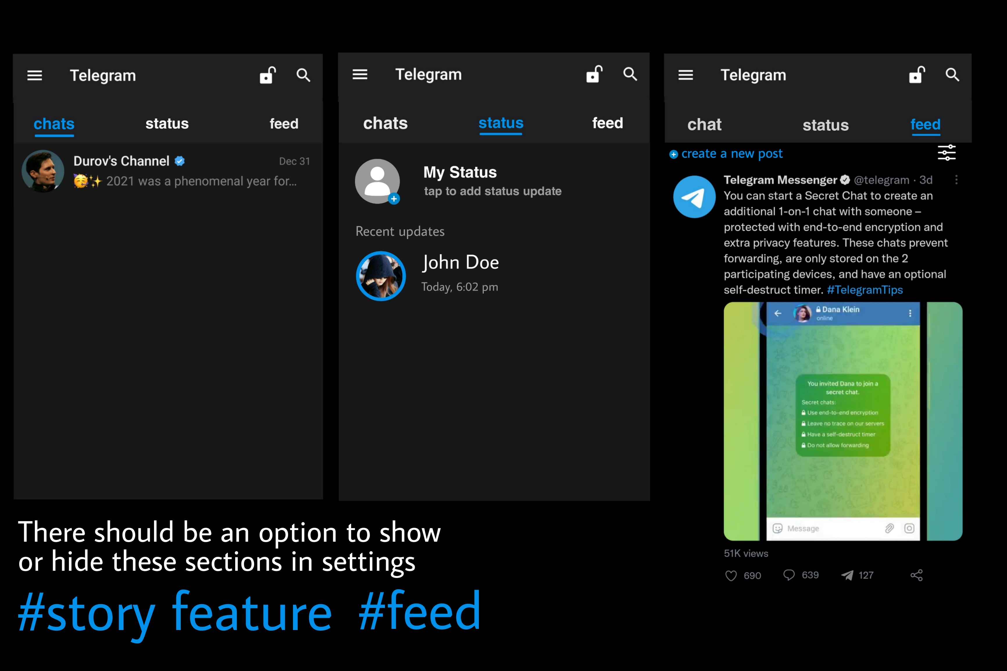 An option in the app settings to completely disable the Stories feature to reduce visual clutter. Official Response: Stories take up no extra space in the Telegram UI – but if you'd prefer not to see…