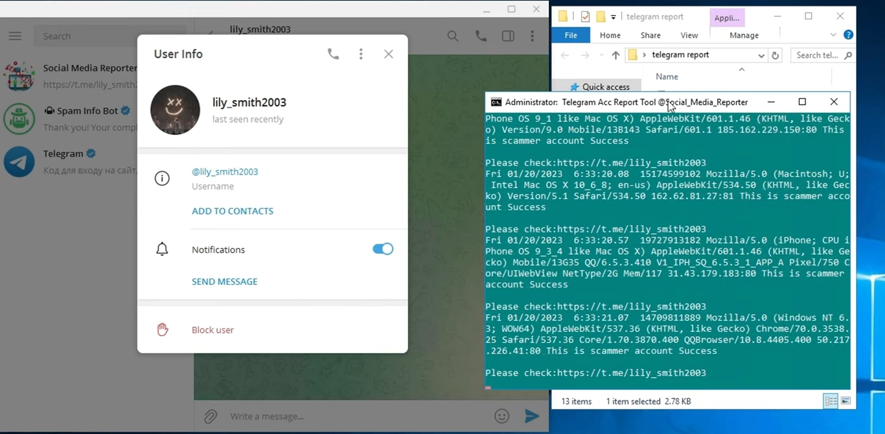 Yeah, tonight my account (@elbrusX, id6837625728) was blocked via this "feature", stalkers send fake reports on accounts, groups or channels, to eliminate competitors for money or just out of personal animosity...