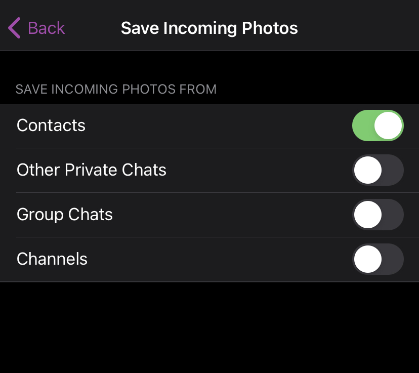 It would be amazing to have te precision of choosing, not only what kind of chat will save media to storage, but also which chats we want this feature on. Much like in privacy options in Telegram, but now directed to this functionality.